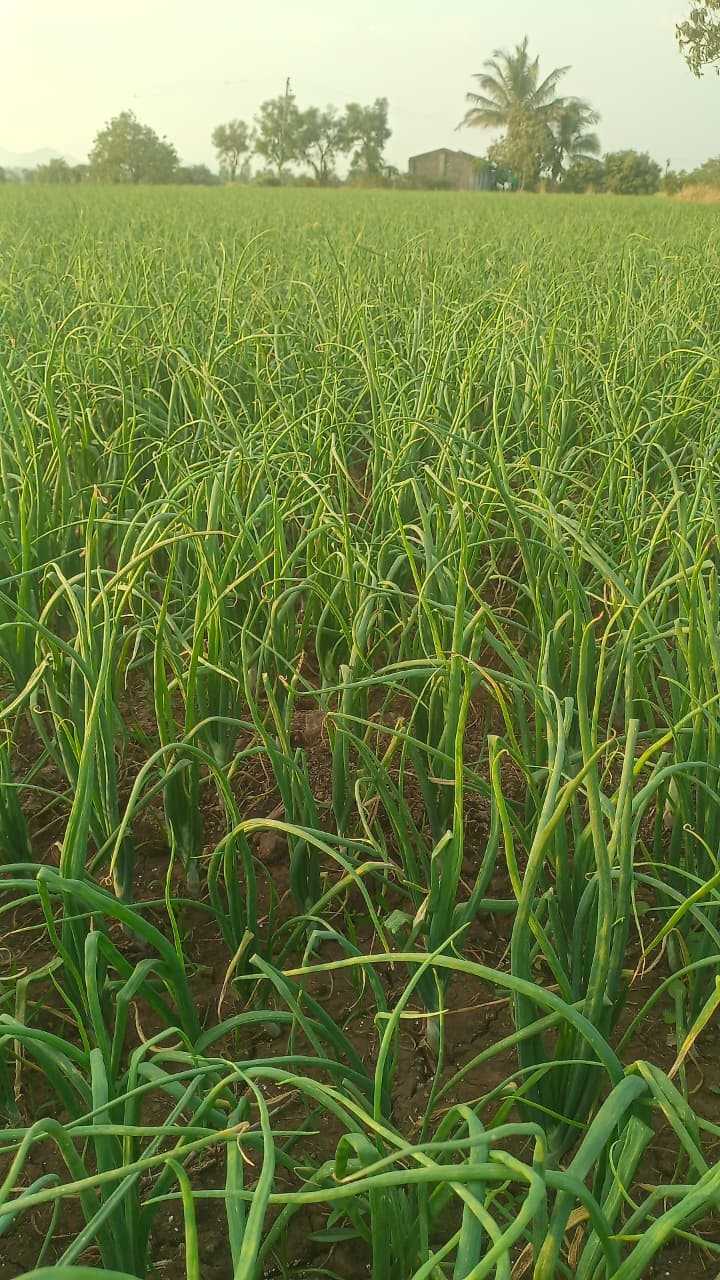 सध्या पीक निरोगी वाटत आहे, कांद्यावरील प्रादुर्भाव रोखण्यासाठी **M-45 (२.५ ग्रॅम) + बाविस्टीन (१ ग्रॅम) + फिप्रोनिल ५% SC@2 मिलि + सूक्ष्म अन्नद्रव्ये/अमिनो ॲसिड@3 मिलि /लीटर पाण्यात मिसळून फवारणी करावी. **. सोबतच, फुलकिडे आणि इतर किडींच्या प्रभावी नियंत्रणासाठी शेतात निळे व पिवळे चिकट सापळे त्वरित लावावेत.